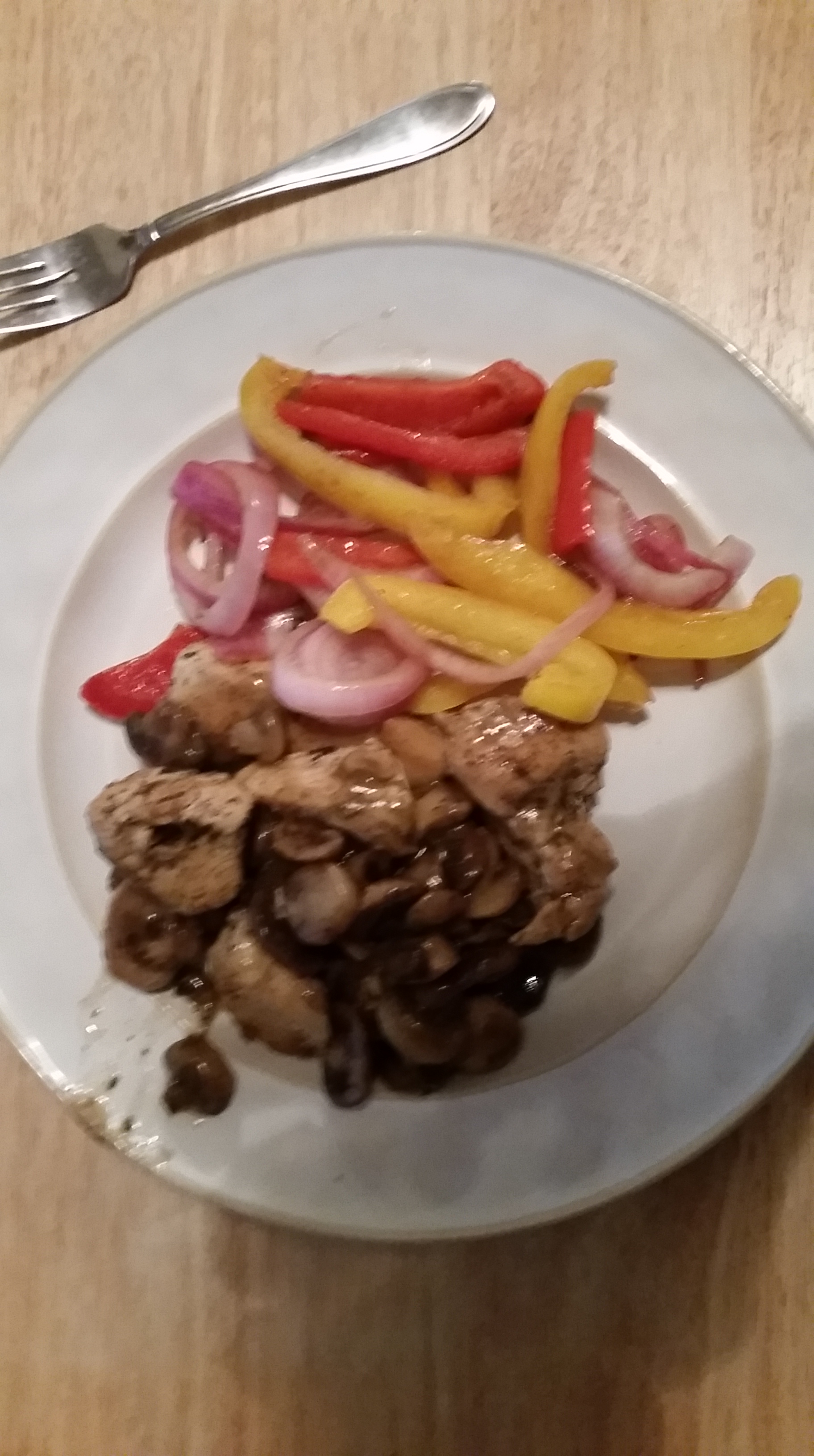 Dinner: Skillet Chicken with Mushroom-Thyme Sauce and Corn on the Cob – 400 cal, 10g fat, 20g carbs, 70g protein, +Chol