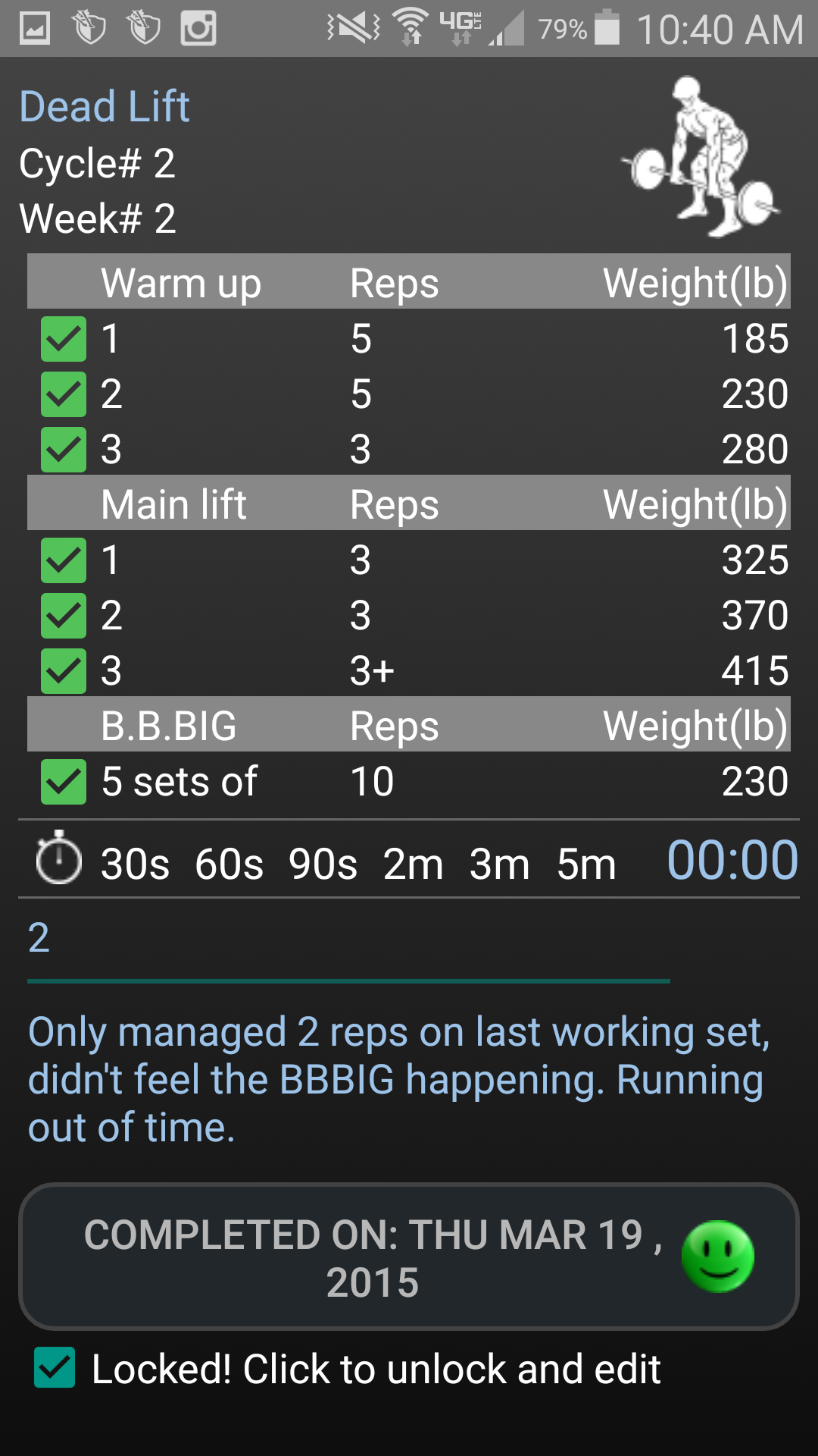 DL session tonight didn’t go as well as I would have liked. I can’t seem to get my form down. I am going to read up on some different DL methods from Juggernaut, Starting Strongman, and Andy Bolton.